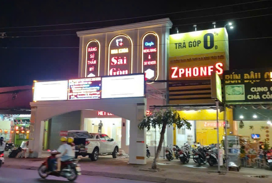 Bảng hiệu alu, chữ nổi mica có đèn. Logo mô phỏng hình ảnh Tháp Tam Thắng hiệu ứng thay đổi màu sắc.